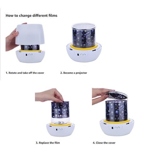 Description:This night light is a perfect gift for a kid’s bedroom. It’s also ideal for decorating events with colorful projected stars. For instance, you can use it to decorate a wedding, birthday party, or even use it during Christmas. You can also use it as a romantic night lamp or as a decorative night light lamp. Its different film shapes project light onto the walls and ceiling. The light creates a relaxed atmosphere and is a great night light for kids. You can either use the night light as a projector by removing the cover or use it as a night light with its cover on. With your company logo on it, it is perfect for company promotional or any event.