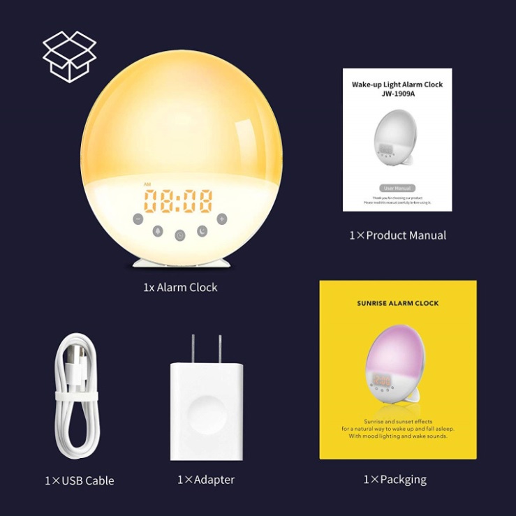 Description:It can simulate natural sunrise/sunset via color and brightness of light changes, white noise hlep you sleep better. 7 Colors Night Lamp with 30 Level warm lights to be used as a night lamp, reading lamp, or a atmosphere lamp, can be used as a FM radio at the frequency range 87.5-108 MHz, alarm clock and snooze function( 5 extra minutes of sleep), 7 natural sounds, also you can make a record of your favorite sound as an alarm sound.