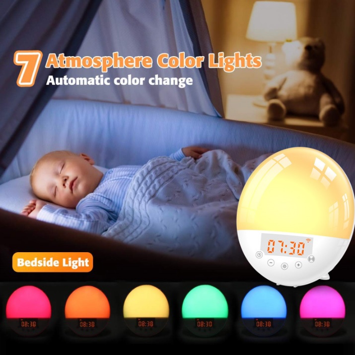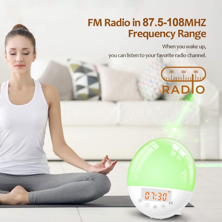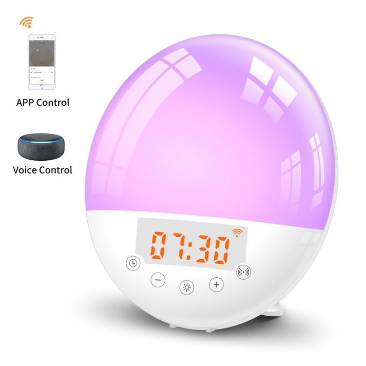 Description:App control LED colorful light alarm clock sunrise wake up lamp WiFi voice intelligent sleep wake up lamp FM radio.It can simulate natural sunrise/sunset via color and brightness of light changes, white noise hlep you sleep better. 7 Colors Night Lamp with 30 Level warm lights to be used as a night lamp, reading lamp, or a atmosphere lamp, can be used as a FM radio at the frequency range 87.5-108 MHz, alarm clock and snooze function( 5 extra minutes of sleep), 7 natural sounds, also you can make a record of your favorite sound as an alarm sound.