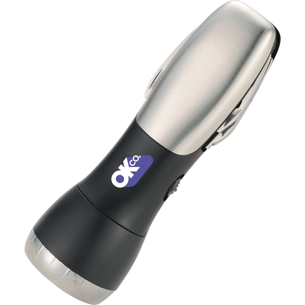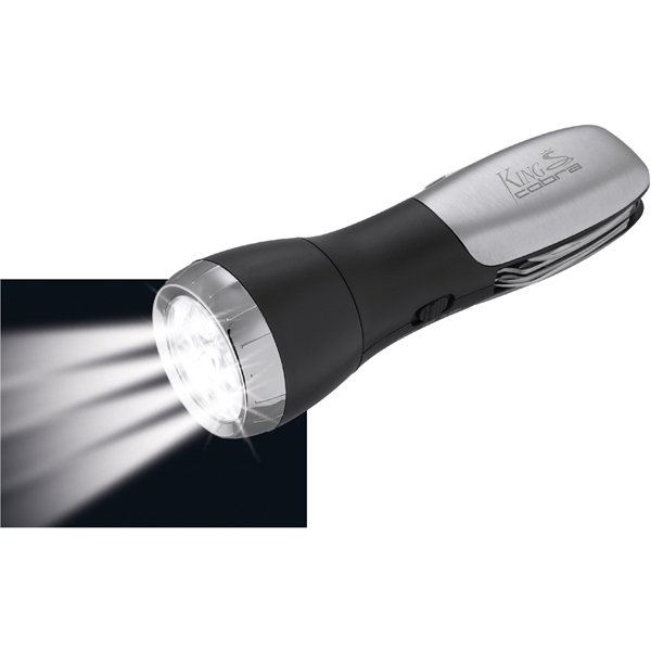 Description:This Multi-Tool Flashlight has 4 white LED lights and a red flashing light function. Slide the power switch to turn it on and off and to switch between functions. Includes a stainless steel knife bottle opener nail file flathead screwdriver with double hexagon wrench fish scalar/hook remover punch saw blade/serrated knife can opener and scissors.Welcome your logo.