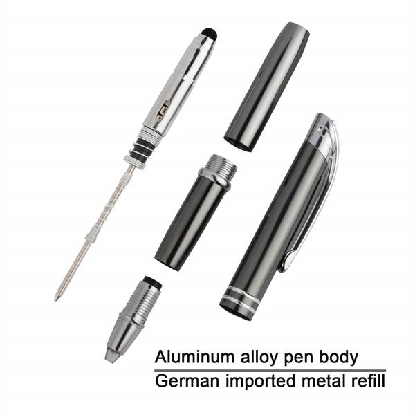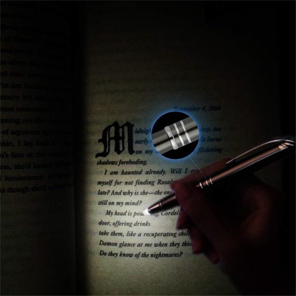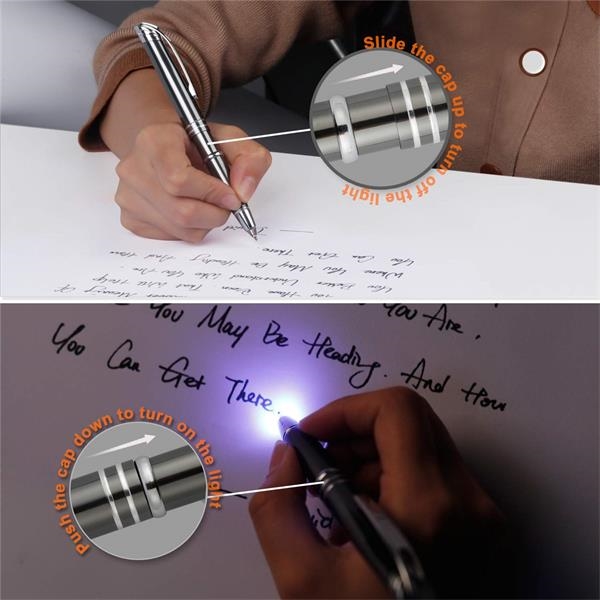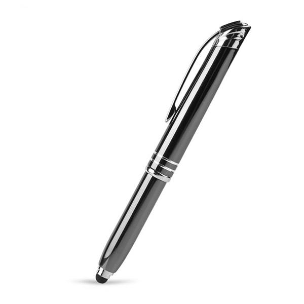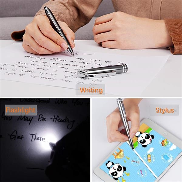 Description:This functional 3-in-1 writing light pen functions: White LED Flashlight, capacitive touch pen, and 1.0mm black ballpoint pen, with excellent cost performance.You can write in the dark without disturbing others. Led light writing pen, Led configuration in the nib position, through the cap knob to control the light switch. Capacitive stylus: This pen is very easy to use on both normal and high-end touch screens. It can be used on iOS devices or on Android and PC devices.Welcome your logo.