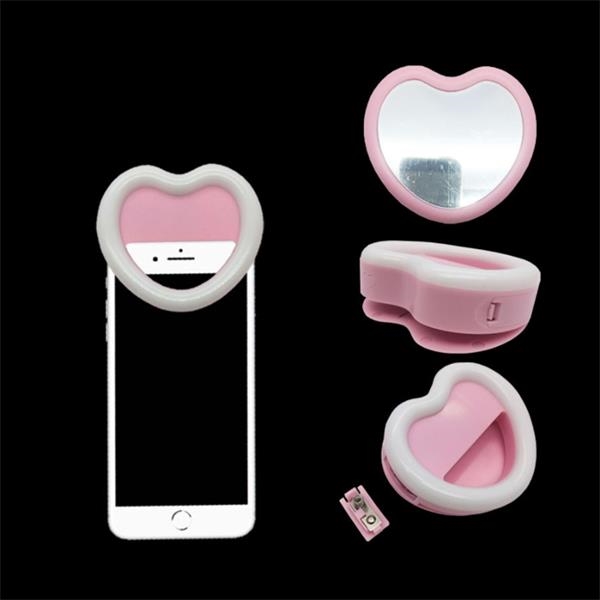 Description:This multifunction heart shaped LED selfie light is small and light weight, it is suitable for doing selfies or when taking photos of others in bad lighting situations.It has also a mirror in the back which comes handy when you want to check your face before you do your selfie. Get this multi-functional gift for your clients today! This price not included batteries.Welcome your logo.