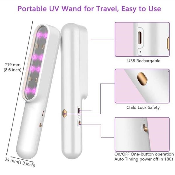 Description:It adopted the selected ABS material and advanced led light beads to ensure obvious sterilization effect and durable. Turns on the ultraviolet sanitizer light wand, simply sweep the portable UV light sanitizer wand across the surface or stuff you desire to clean, it makes the environment safe and clean within 10 seconds without damaging any surfaces, makes non-toxic, no residue, no odor, no secondary pollution. The Smart Auto Timing off in 180 seconds of this portable uv light wand helps to save power, extra thoughtful Child lock avoid kids misuse. The UV sanitizer lamp built-in 2000mAh USB rechargeable batteries. The uv sterilizer light are CE, FC, RoHS certified, not only proven works for disinfecting and sanitizing, but safety in use.Your logo is welcome. Welcome to inquiry.