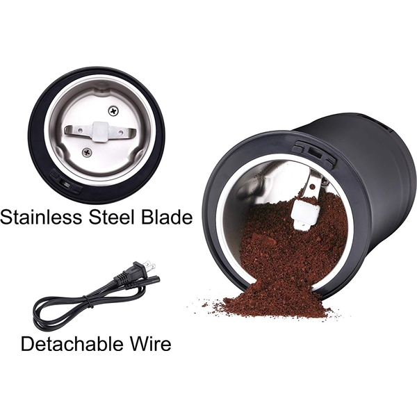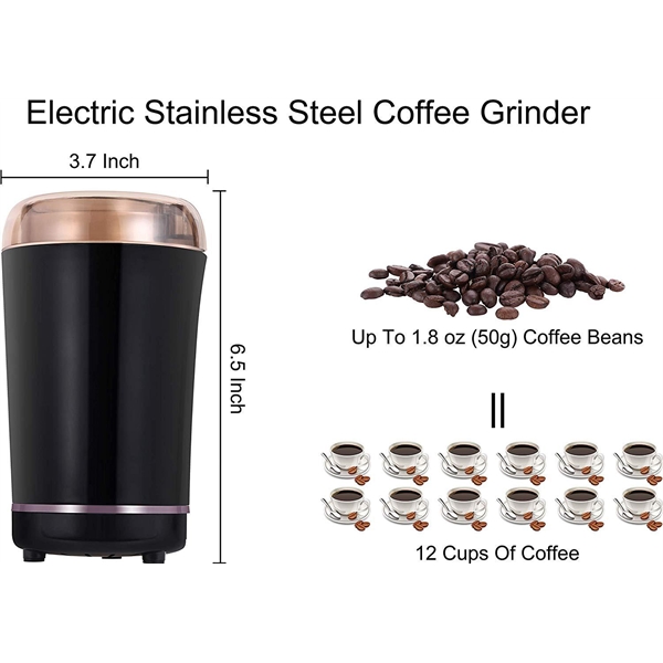 Description:This Electric Coffee Bean Spice Grinder- Comes with 300W motor and 2 sharp SUS304 stainless steel blade offers durability and powerful performance, grinds 50g/1.8oz coffee beans at the same time for 12 cups coffee within 30s, make freshly coffee for the whole family.Multiple Uses – it is not just work for grinding coffee beans, this coffee grinder can grind spices, nuts, pepper, seeds, grains and more.This powerful grind can chop up your coffee beans,spice and nut with minimal noise just a few seconds.It is portable with detachable wire,so you can take it to office,home,school and etc.Your logo is available.Welcome to inquiry.
