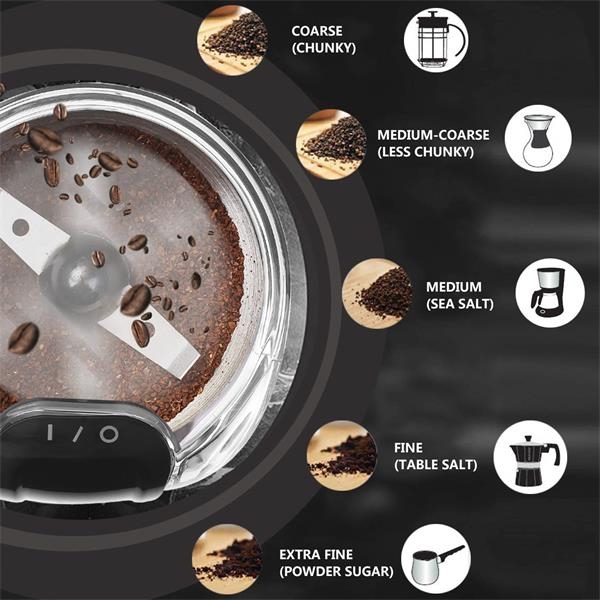 Description:Our coffee machine is easy to use. Just press the cover at different times to perfectly control the grinding accuracy. The high-quality 301 stainless steel blade and 150W powerful motor ensure continuous and even grinding, so as to better maintain the original rich aroma and oil of coffee beans.Compared with the traditional manual coffee grinder, it saves time and energy. Through the transparent cover, you can observe the grinding process and obtain coarse or fine powder for cold brewing coffee, French pressing, pouring, moka pot, espresso.Custom logo available.Welcome to inquiry.
