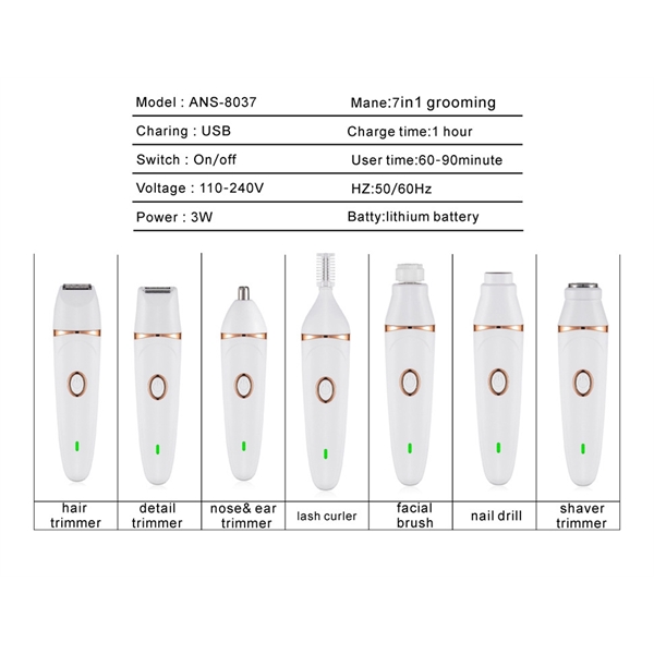 Description:The epilatior for women kit includes 7 in 1 Electric Razor, Precision Bikini Trimmer Head, Facial Cleansing Brush Head, Facial Shaver, Eyebrow trimmer, Anti-Allergy Foil Shaver Head. Shaving, Callus removal, cleaning and Massaging, just need a 7-in-1 shaving set can meet all your shaving needs!Facial hair remover kit are with advanced hypoallergenic razor head and stainless steel blade. They are durable and ergonomic, easy to use. Facial hair remover for women slides easily in all directions, providing a smooth, fast cutting experience without irritating the skin.USB Rechargeable Shaving groomer kit has high capacity battery, no need to charge frequently.Note: charging adaptor Not included..IPX5 Waterproof Design makes the razor safe to use even in bath or shower with foam.Custom logo available.Welcome to inquiry.
