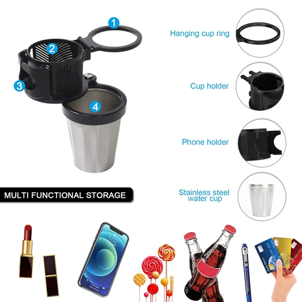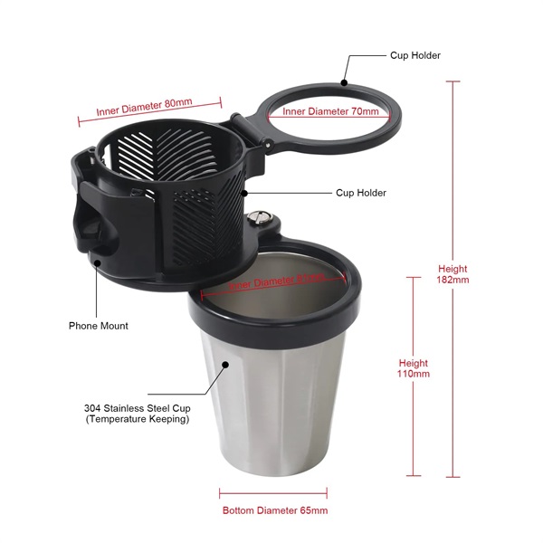 Description:The tray can be adjusted casually while it may hinder driving. This cup holder is equivalent to multiple storage boxes, which can be placed in various small items such as pens, glasses, changes, mobile phone, drinks, keys, snacks and so on without making any mess.The tray can be take off easily. Also on top of the supporting rod, there is a removable part for solid aroma fragrance. It helps improve the air inside the car.The bottom cup is made from 304 stainless steel. It keep drinks warm for 3 to 4 hrs normally, and cold for about 5-6 hrs. With an inner diameter 90mm, it fits for most of the drinks and bottles.This cup holder fits for most of the car brand, such as vehicles, boats, motor homes, UTVs, etc. As long as there is a cup groove in your car.