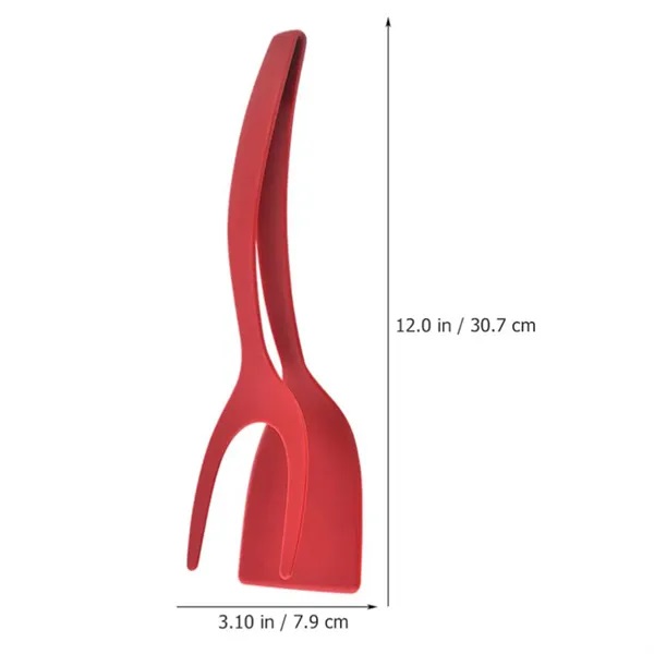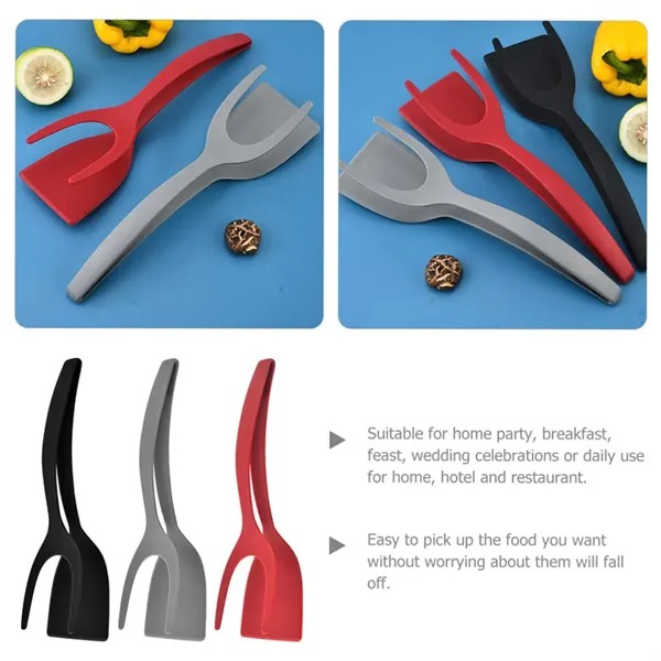 Description:Our 2-in-1 Grip and Flip Spatula Tongs is the ultimate kitchen tool for cooking eggs, pancakes, fish, French toast, omelets, and more. This versatile spatula is perfect for flipping and gripping a variety of foods, including omelets, steaks, and patties. Made from non-stick nylon, it wont scratch your non-stick pans, ensuring they remain in top condition. The larger-than-normal tongs provide a strong grip, making it easy to turn and grill fish, beefsteak, and other meats. With an ideal opening height and flexible, smooth rebound, this spatula clamp is a must-have for any kitchen.