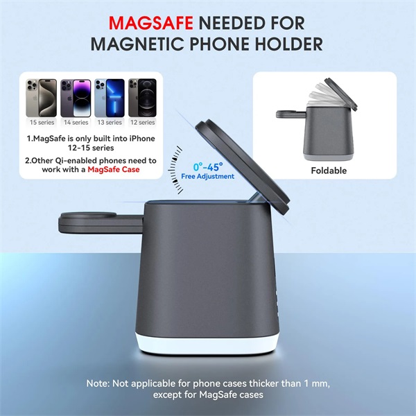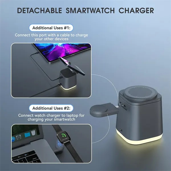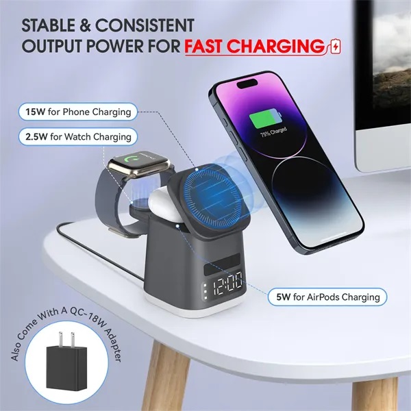 Description:Designed for wireless charging iPhone and smartwatch & Airpods simultaneously with just one cable. It will brings you an easy and convenient charging experience, saving space and no more messy cords, suitable whether on the nightstand or the office desk use.Built-in alarm clock function to show the time and provide wake-up calls, saving you money without having to buy additional alarm clocks in separate.3 colors night light, one-click switch, adjustable brightness, can be used as an ambient light at night.Tiny body,about the same weight and size as a small coffee cup that makes it easy to carry in your bag or suitcase,providing a stable charging experience during travel or business trips, you only need to take one our MikoDream Charging Dock for 3 devices charging.Our charging station char