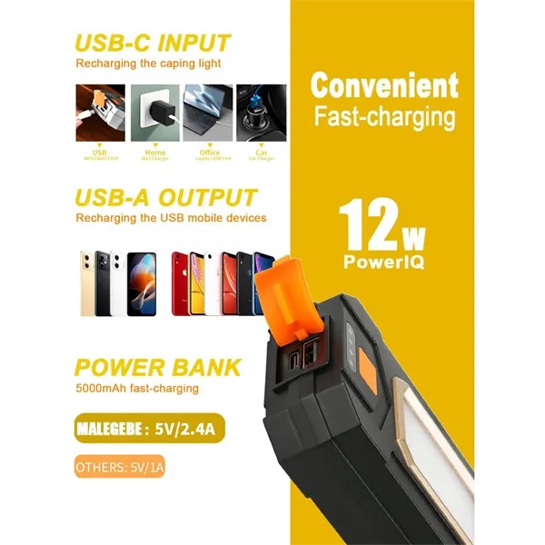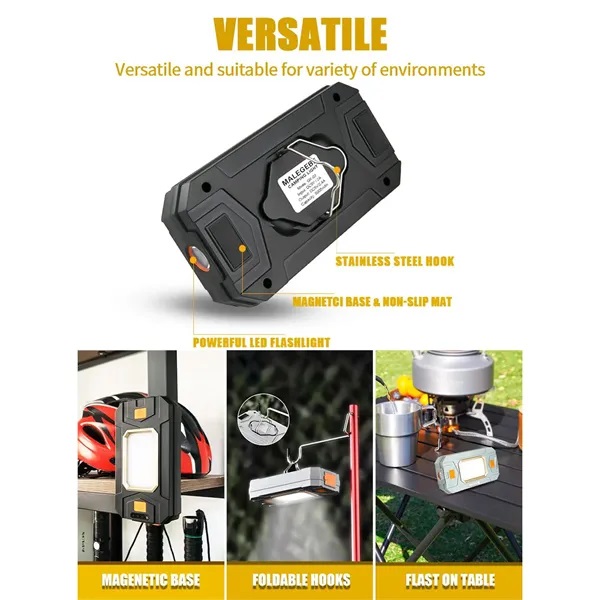 Description:Illuminate your adventures with our USB Rechargeable Magnetic Waterproof Camping Tent Light! Featuring a powerful 1000 lumens COB light visible up to 215 feet and a 400 lumens long beam flashlight, this lantern also doubles as a 5000mAh fast-charging power bank. The built-in battery provides up to 10 hours of light at full brightness and up to 96 hours on energy-saving mode. Equipped with two hooks and strong magnetic bases, it can be easily hung or attached for versatile use. Waterproof and rugged, it withstands splashes and drops up to 1.5 meters. Compact and lightweight, its perfect for outdoor activities in any weather.