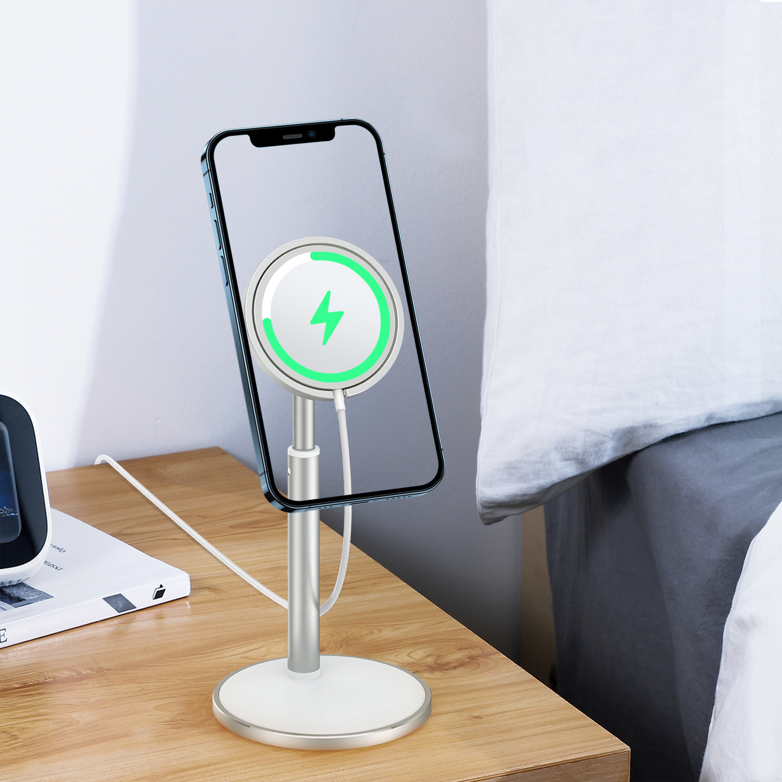 Description:Hole design, easy to disassemble charger. Magsafe charger is protected by silicone pad. Made of aluminum alloy, the base is stronger and more stable. Scientific perspective, free adjustment, lifting telescopic, free adjustment Angle. Let you in daily life, charging entertainment both wrong.