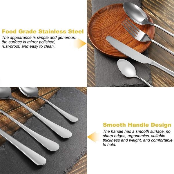 Description:This product is mainly made of stainless steel material, wear-resistant and not rust.It is mainly composed of 6 knives, 6 spoons, 6 forks and 6 teaspoons.Exquisitely packaged gift box, which can be used or given as a gift to others, you can also customize the logo you want.This style is mainly silver, please consult us for other colors.