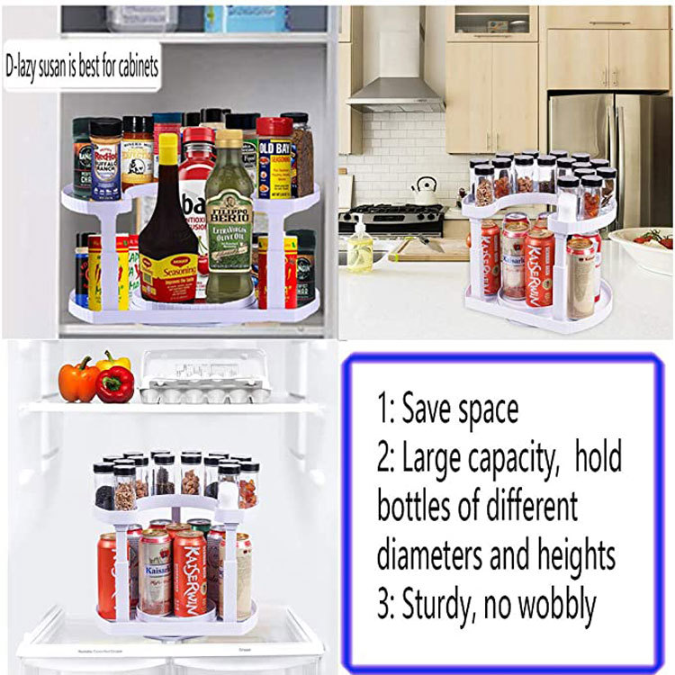Description:The shelving adopts ABS material, wear-resisting and fall-resisting.Double layer storage, with large capacity space.4 height adjustment, can be adjusted according to the placement of items, do not worry about the size of items.D type design, the middle can be rotated, easy to take.Can be used in the kitchen condiment rack, can also be used for cosmetics, you can also print the logo you want, the specific details can consult us.