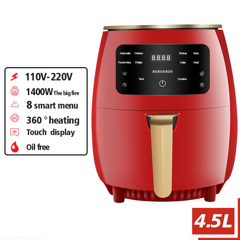 Description:This model is mainly through the top quality spiral stainless steel electric heating tube to heat the air quickly, through the high-power fan to let the heat flow in the food basket rapid circulation.The special whirlpool pot at the bottom of the food basket forms whirlpool heat flow, which touches the surface of the food materials in a full range and 360 degrees, and quickly takes away the water vapor generated during heating, thus forming a golden and crisp surface layer on the surface, achieving the appearance of frying and fresh taste!Enjoy delicious food with your family! Replace hot oil with air, start low fat and light life.This air fryer is 1400W big fire, 8 smart menu, 360 degree hearting , touch display and oil free. Large capacity,4.5L. The fuselage is made of ceramic.Let this Let this Intelligent touchscreen air fryer as your next promo.WELCOME TO INQUIRE.