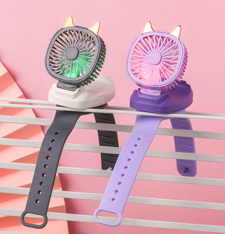 Description:This small fan adopts ABS material, wear resistance and fall resistance, fan Angle direction can be adjusted arbitrarily.The watchband is made of skin-friendly silicone watchband, which is removable and safe to wear.Pressing and pop-up design, light and easy to press to provide air upright.Three speed wind, free control.Inside with colorful lights, warm heart.Multiple colors are optional in this section, please consult us for details.