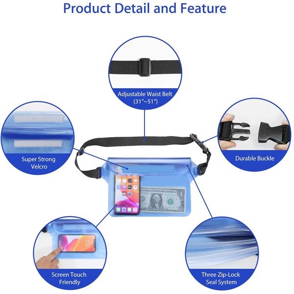 Description:Made of premium soft touch PVC materials, prevent your belongings from being scratched by sharp objects like stones or branches. The transparent pouch is 100% waterproof, snow-proof and dust-proof, with super waterproof seal performance, this waterproof bag provides comprehensive protection for devices in a variety of environments. Features include Three Zip-lock Seals, which ensures a perfect seal, and keeps your phone and valuables safe and dry. The waist belt is adjustable and long enough to wear comfortably.This section can also print the logo you want, you can consult us for details.