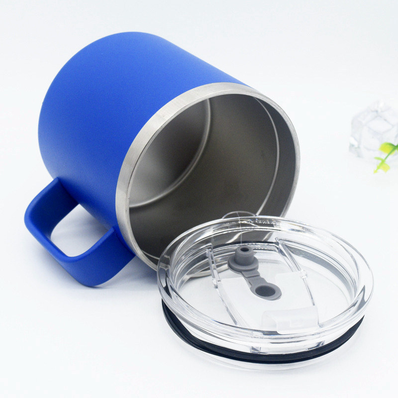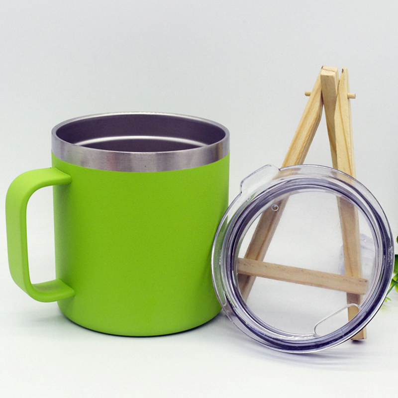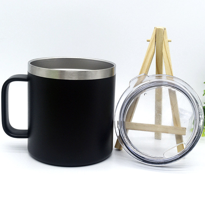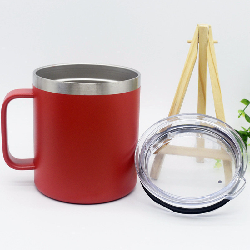 stainless steel mug has a double-wall insulated copper lining and holds 14 ounces of your favorite brew. It has a wide handle and a clear, push-in lid for easy drinking. Choose from a range of colors and add your organizational or company logo, emblem or message to customize.