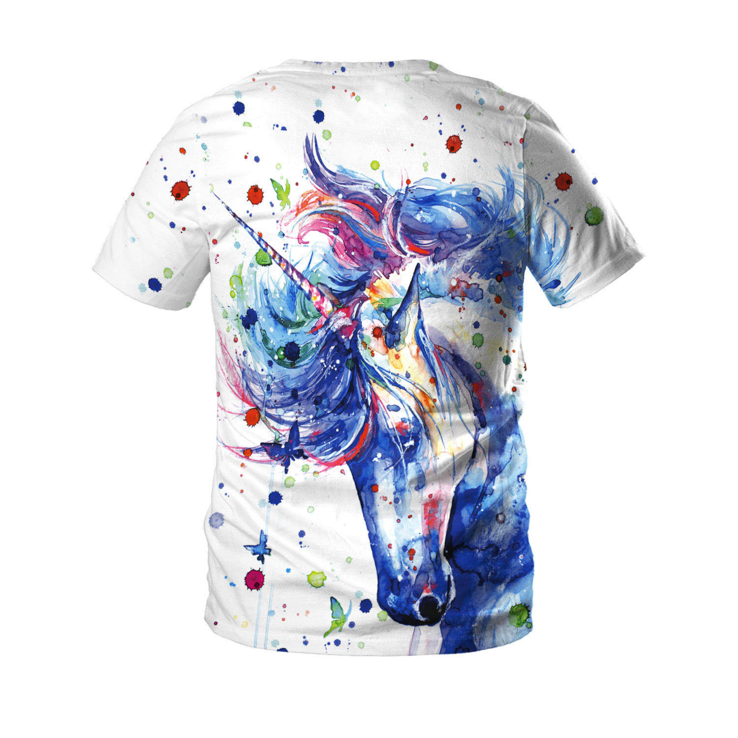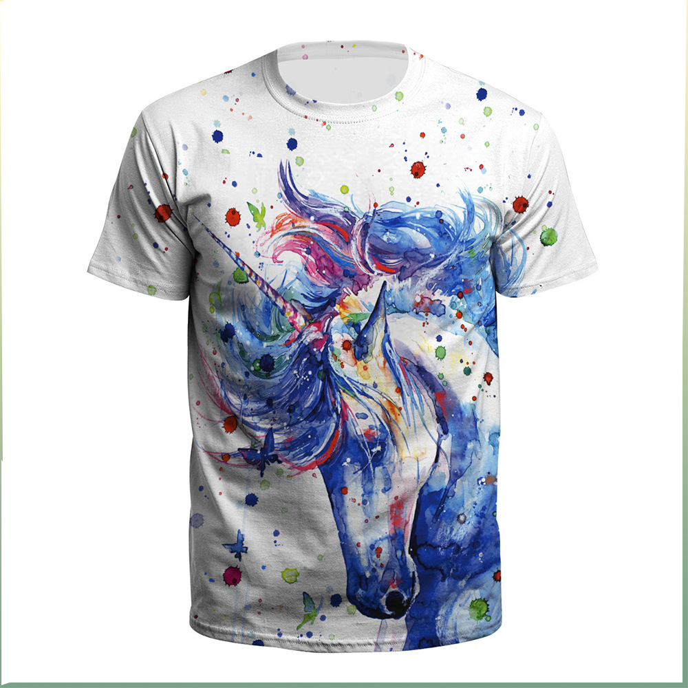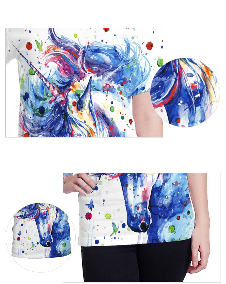 Description:This T-shirt is made of polyester fiber and has short sleeves and loose ends.Round collar design, loose – fitting.The T-shirt features a watercolor unicorn for added personality.This section is S size, 15.67 shoulder width, 36.22 chest girth, length 25. This section can also print the logo you want, you can consult us for details.