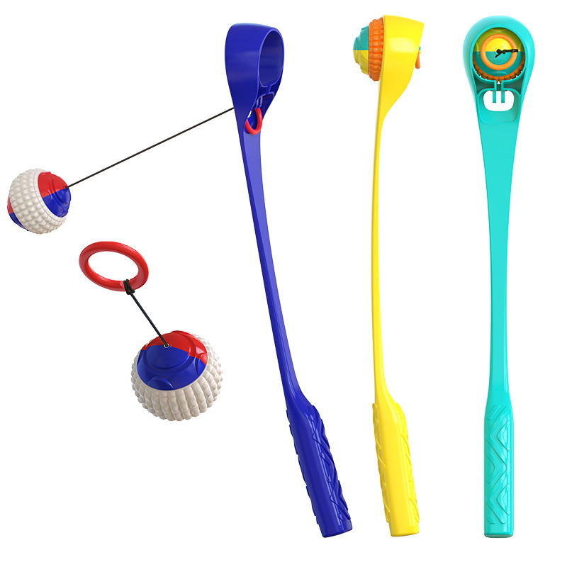 Description:This is a pet toy for human-pet interaction, which integrates various functions of human-pet interaction, such as ball-throwing, pet ball with automatic retractable drawstring and so on. Throwing club: the molar ball is easily installed on the top of the throwing club, and the molar ball can be thrown to the distance by swinging the arm directly. It is very hygienic without bending over. Pet ball with automatic retractable pull rope: the molar ball can be connected with the throwing club through the pull rope buckle. Under the restriction of the pull rope buckle, the range of the molar ball can be controlled to interact with the pet. Ring retractable drawstring ball: The molar ball has a retractable drawstring inside, which can also be used to interact with pets through the circular buckle on the other end of the drawstring.