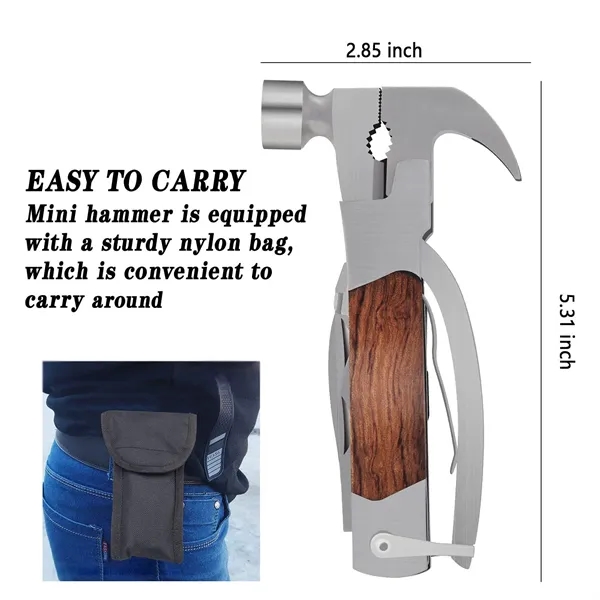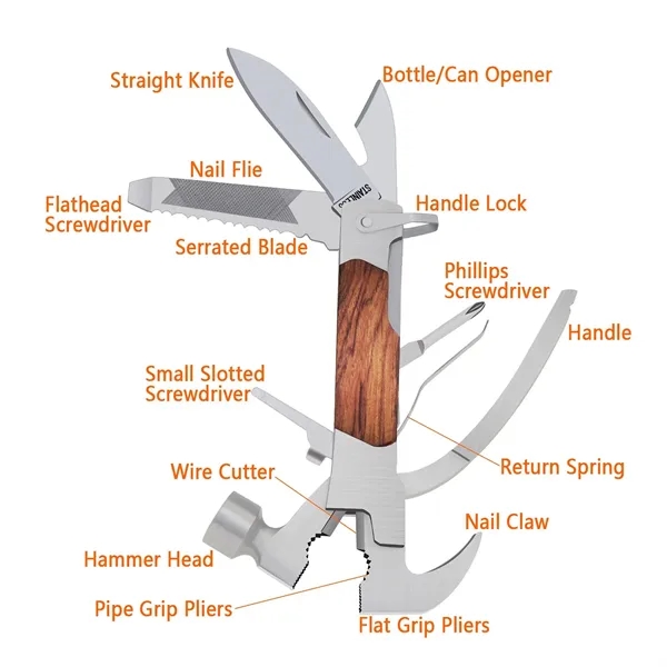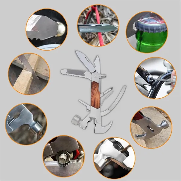 Description:14-in-1 multitool includes a mini hammer, pliers, wire cutter, knife, saw, screwdrivers, bottle opener, and carabiner, all with a safety lock. Comes with a durable nylon bag for easy portability, making it great for camping, hiking, and emergencies. Made of rust-resistant stainless steel for durability and reliable use at home or outdoors. Perfect for home improvement, outdoor adventures, and as an emergency tool in cars.