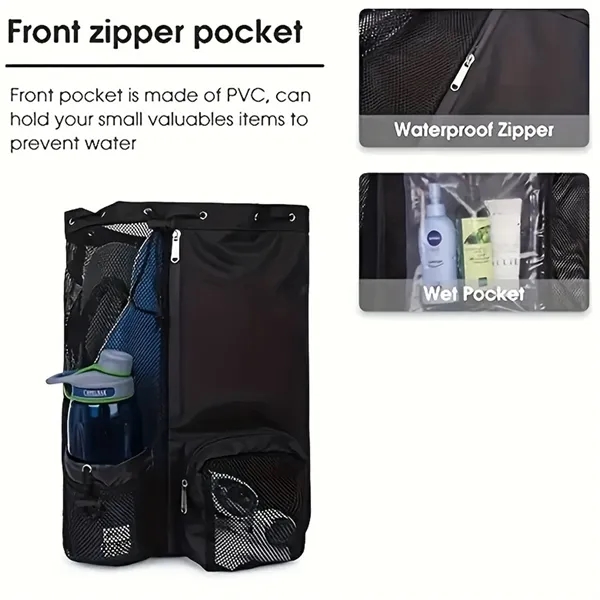 Description:The Mesh Drawstring Backpack is a beach and gym essential designed for those who need a versatile and functional bag. This swimming bag features a breathable mesh material that allows for quick drying of wet items, making it perfect for carrying damp swimwear or gym clothes. The drawstring closure ensures that your belongings stay secure while the separate wet compartment keeps your dry items protected. Ideal for cross-border travel, this bestseller is a must-have for anyone who frequents the beach or gym, providing a practical solution for organizing and transporting your gear.
