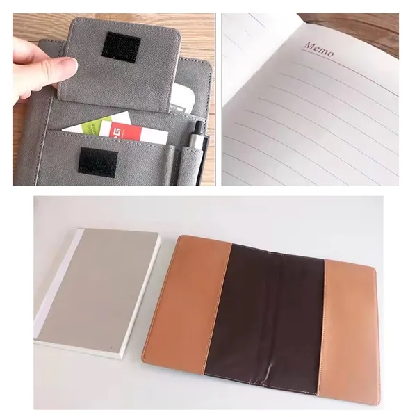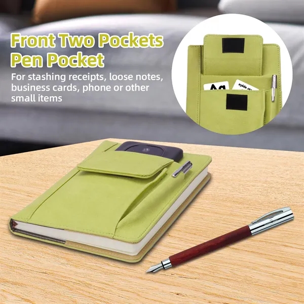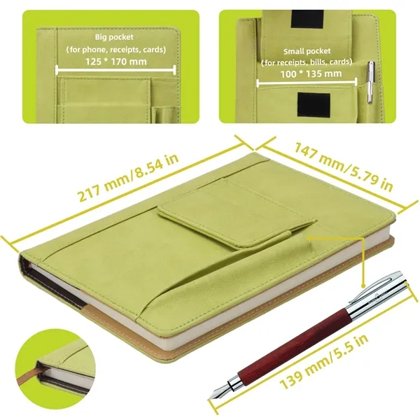 Description:This notebook features a coated PU cover with a front phone pocket (14 x 10 cm), a pen pocket, and one main pocket, providing both style and functionality. Inside, you’ll find a black page divider and 160 pages of 80g paper, making it perfect for all your writing needs. The cover is designed to be reusable, allowing you to easily replace the A5 notebook paper for endless writing. The front pockets offer a unique and convenient design. The larger pocket can hold most types of phones, while the smaller pocket is ideal for storing cards, receipts, or other small items. The pen loop keeps your pen secure and accessible. This portable design is perfect for various occasions, whether you’re brainstorming ideas, engaging in creative writing, or taking quick notes on the go.