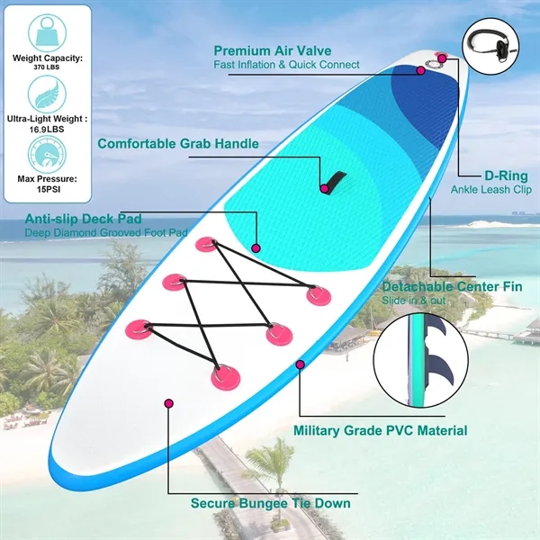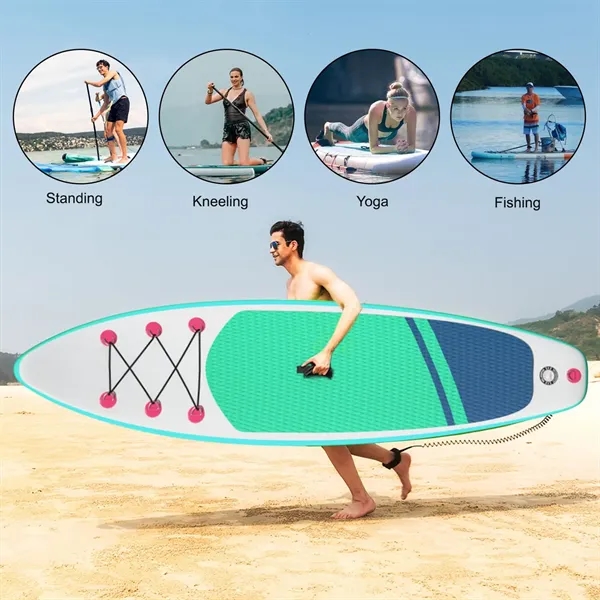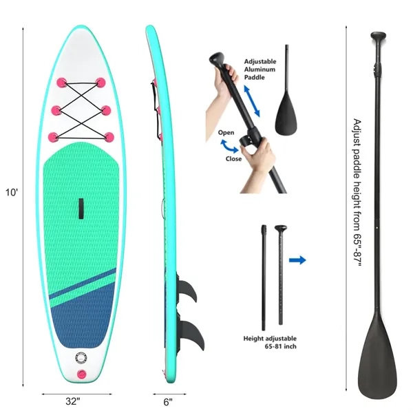 Description:Stand up Paddle Board Inflatable. Portable inflatable paddleboard inflates and deflates quickly, making it perfect for camping, boating, and limited storage spaces. Features three bottom fins for smooth steering and speed, providing excellent control. Built with drop stitch, waterproof, and corrosion-resistant construction, it’s ideal for fishing, cruising, and surfing. Suitable for all ages, this stable board design is safe for lakes, oceans, rivers, and more. Comes with essentials: paddle, air pump, safety leash, repair kit, and storage bag.