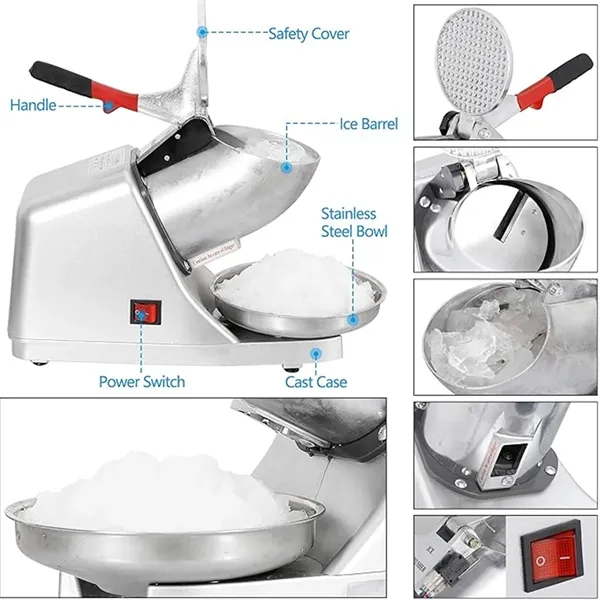 Description:Make tempting icy treats and frozen drinks at home! All you need to do is put in a bit of elbow grease, listen to the gentle scraping and watch chunks of ice turn into mound after mound of soft snow. Dessert is done! This machine, due to its superior material and delicate workmanship, ensures great durability, safety and high efficiency. Powered by electricity, it is able to shave a hard and large ice into tiny one. Also, it comes with a stainless steel bowl for convenience. Isn’t it a practical item for each household? All stainless steel waterproof construction stands years of use and guard against rust, heavy cast base offer fully stable workstation to ensure vibration and noise will be deducted to the lowest degree.