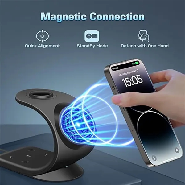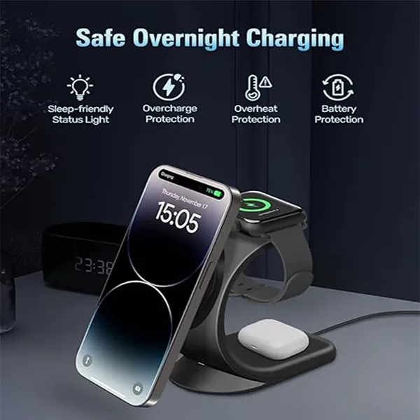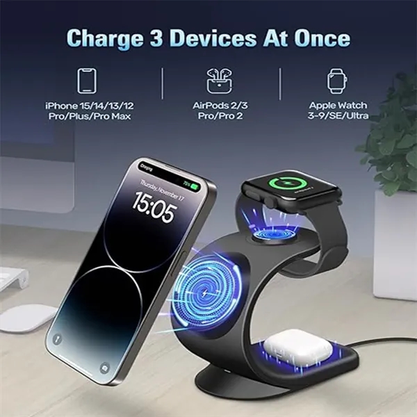Description:Simplify charging and keep your Apple Magsafe device safe with this 3-in-1 iPhone charging station. The super magnetic design lets you place your phone on the stand for precise and efficient charging, while the raised charging part improves efficiency and usability. Say goodbye to tangled cables and streamline your charging experience with this convenient solution. Charge up to three devices simultaneously with the Apple Magsafe charger and keep your desktop clutter-free. Compatible with iPhone 15/15 Pro/15 Pro Max/iPhone 14/14 Pro/14 Pro Max/14 Plus13/13 Mini/13Pro/13Pro max/12/12 Mini/12 Pro/12 Pro Max, iWatch 8/7/SE/6/5/4/3/2, and AirPods 3/2 Pro/Pro 2, this charging solution makes it easy to keep all your devices fully charged in one convenient place.