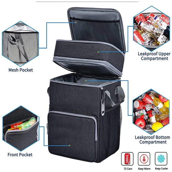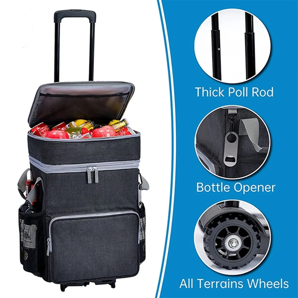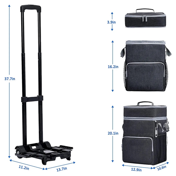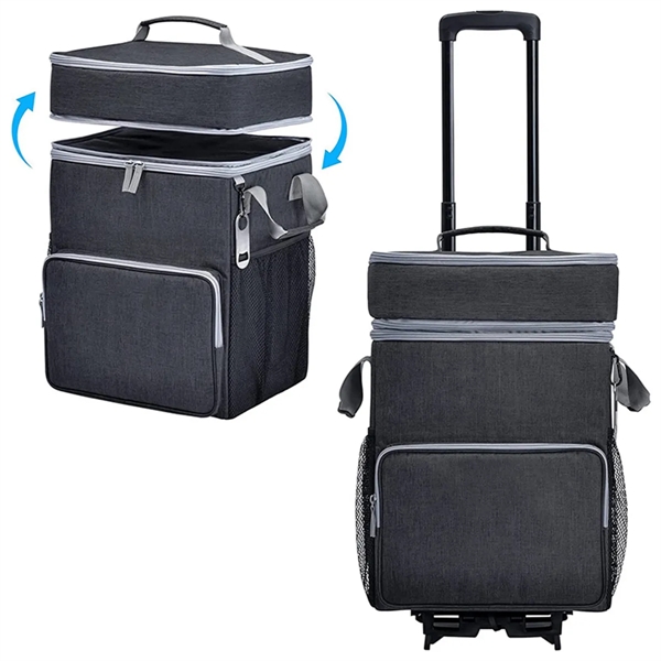 Description:Bring along a bunch of lunch or enough drinks for the whole crew in this rolling cooler that’s ready to come along for the good times. Made of Oxford fabric, this 12.9 x 10.6 x 20.1 cooler has two insulated main compartments, an insulated front pocket, two side mesh compartments, wheels that let it roll and a long, telescoping handle. Holds 72 cans of your favorite beverages or the equivalent in food and snacks. Great for tailgates, barbecues, picnics and other outdoor fun. Available in assorted colors. Add your organizational or company logo or message to customize.
