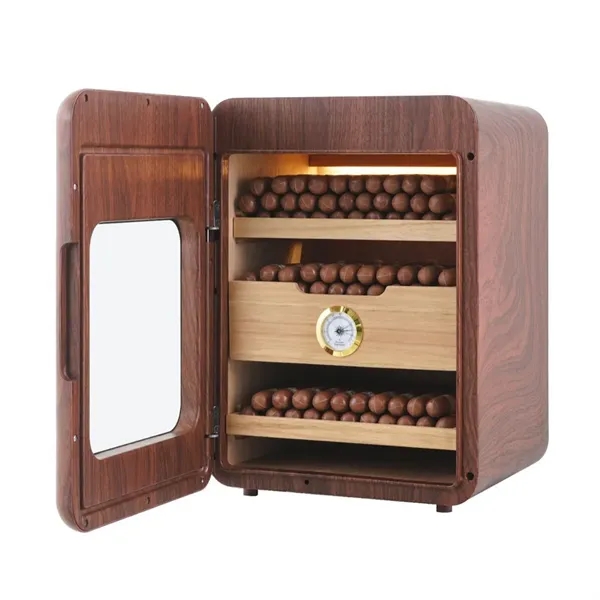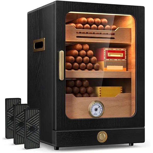 Description:You to observe the condition of your cigars without opening the cigar humidor box door and without affecting the humidity level inside. On top of the cigar cabinet has an LED lamp switch, enter the electrodeless mode, adjusting the intensity of the light as you at will. Cigar Humidors has 3 tiers of storage wood frames of different capacity sizes to store approximately 150-200 cigars depending on the cigar ring gauge. The bottom pull-out accessory drawer with retractable grips can store additional cigar accessories or cigar collectibles and supports flexible customization to complete your collection. The liner made of natural cedar wood gives off a natural wood aroma, which not only moisturizes and breathes, but also keeps your cigars fresh and tasty.