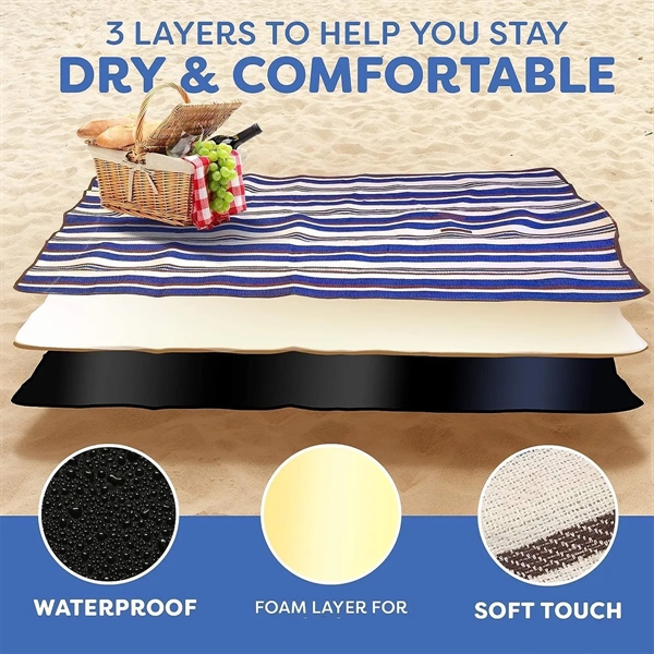 Description:Simply use the 4 included durable ground stakes to secure your beach blankets against windy beach weather and active use. Our beach blanket can be set up and secured quickly & easily. Comfort meets durability with our waterproof beach blanket. Lightweight and soft yet impressively strong, our beach blanket oversized surface is designed to hold up to the great outdoors. Our beach mat sand-proof extra large design folds up neatly, so take it out on your next grand adventure or to tuck it away during the cold months. Whether bringing your sandless beach blanket to the beach, the lake, or even in your own backyard, we hope our sand proof blanket helps connect you with nature’s beauty.
