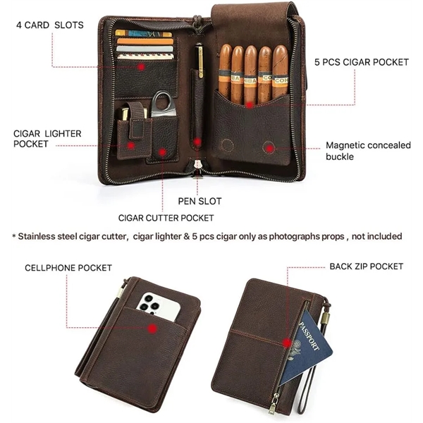 Description:Handcrafted from genuine cowhide.This exquisite 5-cigar holder comes with a convenient wrist zipper for easy access, making it the perfect companion for your travels. Handmade with precision and attention to detail, this multifunctional cigar travel case not only showcases a stylish design but also emphasizes durability and practicality. Safeguard your cigars in style and enjoy the convenience of this sleek leather case, designed for aficionados who appreciate both quality and functionality. Elevate your cigar experience with our leather cigar case- where luxury meets utility.
