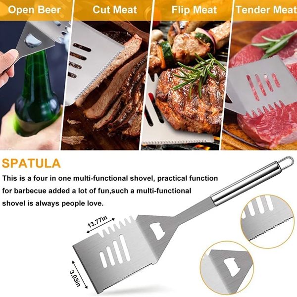 Description:Made of extra thick solid food grade 304 stainless steel, which is rust resistant, not easily bent or breakable, BPA free, rust-proof, resists heat. With adjustable hanging straps and protable storage design, easy to store and can take it anywhere anytime. 7Pcs BBQ Grilling set include everything you need to cook like a professional grill master. Package Included: 1 X Muti-functional Apron also can be used as Carry Bag, 4-in-1 Chef Spatula, 2 X Pepper & Salt Shakers, 1 X Heat Protective Gloves. Great gift idea for your next powerful promotion.
