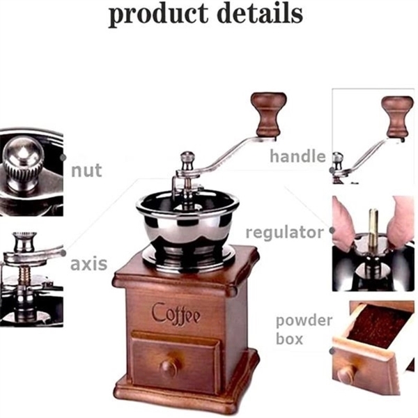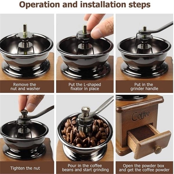 Description:This manual coffee grinder is great because it’s portable, noise-free, and produces much less heat than traditional electric coffee grinders.Use the settings to find the perfect bean size for your coffee brewing needs. With the turn of the handle, you’ll produce perfectly coarse ground coffee beans every time.This espresso grinder is well made and unique design with razor-sharp stainless steel blades that are tough as nails.Put this dapper bean grinder on display after you’re finished preparing a delicious cup of your favorite coffee. It looks fantastic displayed on a kitchen countertop or little barista section in your home.You’ll be floored at how good your coffee tastes. Customize with an imprint of your company logo and message for heightened brand awareness.