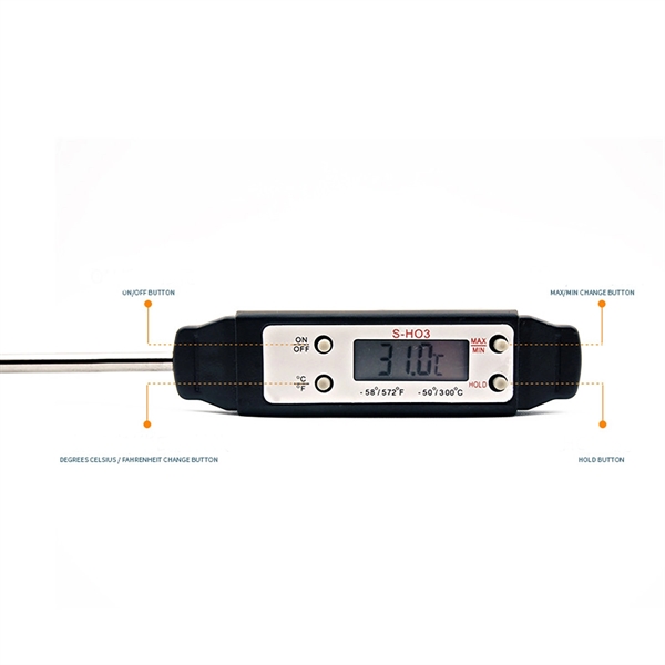 Description:Prepare beef, chicken and pork to a temperature that’s safe to consume with the help of this kitchen meat thermometer. Made of durable ABS plastic with a stainless steel sensor probe, this 216mm x 25mm x 14.5mm battery operated device has an LCD display that give quick and accurate results. The auto shutoff engages after 10 minutes to save on battery power. Available in assorted colors. Add your school, sports team, organizational or company logo or message through our signature silkscreen process to customize.