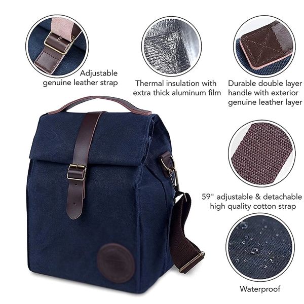 Description:Pack all of your favorites in this insulated cooler bag! This item is made of 12-ounce waxed cotton canvas and measures 11.2 x 9.5 x 7.3 in size. With a storage capacity of 10 liters, this product also comes equipped with a strap and buckle closure, an aluminum foil lining, a separate zippered compartment, a leatherette carrying handle, and a detachable shoulder strap. Head into work in style and order for your company or business!