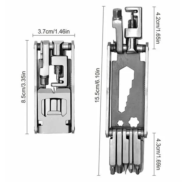 Description:Function All In One Tool, Hex Wrench 2.5/5/8mm, Litter Batter Screwdriver, Phillips Screwdriver, Sim Card Open Eject Pin, Wrench 6/7/8/10/12/14/Mm, Wrench 6/10mm,Spoke Wrench, Chain Tool, Knife, Nail Puller, Fix Most Problems Of Your Bike With This Tool. Heavy Duty, Compact And Rugged Stainless Steel Construction. Great As A Men’s Or Women’s Gift Or For Camping, Outdoors, Auto, Or Hardware. Limited Lifetime Warranty. Pocket Size, Easy To Carry, All In One Tool For Outdoor.