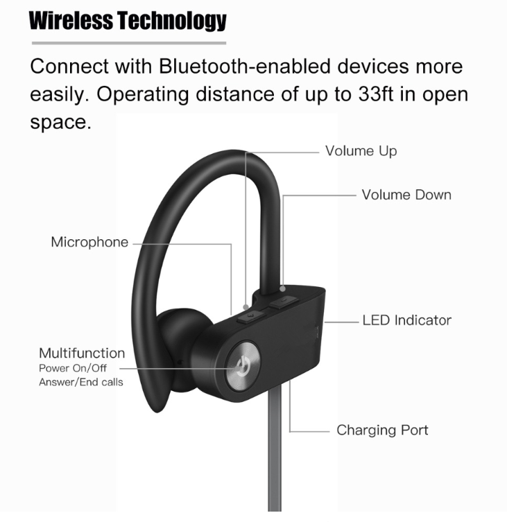 Description:Great for Running, Jogging, Hiking, Biking, Gym etc.Best workout sweatproof Bluetooth headphones.Stay in Ear Tech with Comfortable Ear Hook. Neckband design, no wires tangling, and it’s easy to storage to your sports armband or arm package bag.Music playing for full battery charge. Super quick charge time with full charge light indication.The headphone battery status will be automatically displayed on the IOS Phone screen.