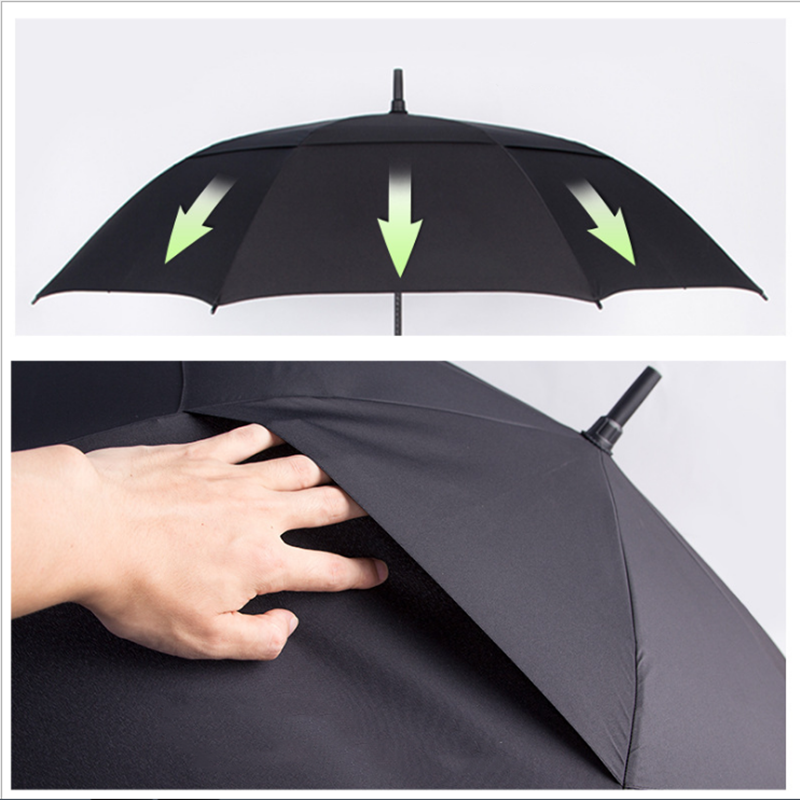 Description:Double automatic business golf umbrella, the opening radius is 30 inches and can accommodate three people,made of 210T crash fabric.Double-layer air travel design on the umbrella surface increases the anti-wind performance of the umbrella.Fabric has a strong water-repellent ability.double umbrella belt design, the use of belt umbrella cover, storage and use more convenient.The umbrella handle is designed with long and thin straight rod, rubber material, which can be opened automatically by switch.The ribs are tough and safer to use.Can be used as golf umbrella, advertising umbrella, advanced advertising umbrella, commercial umbrella.Logo can be printed inside and outside the umbrella.