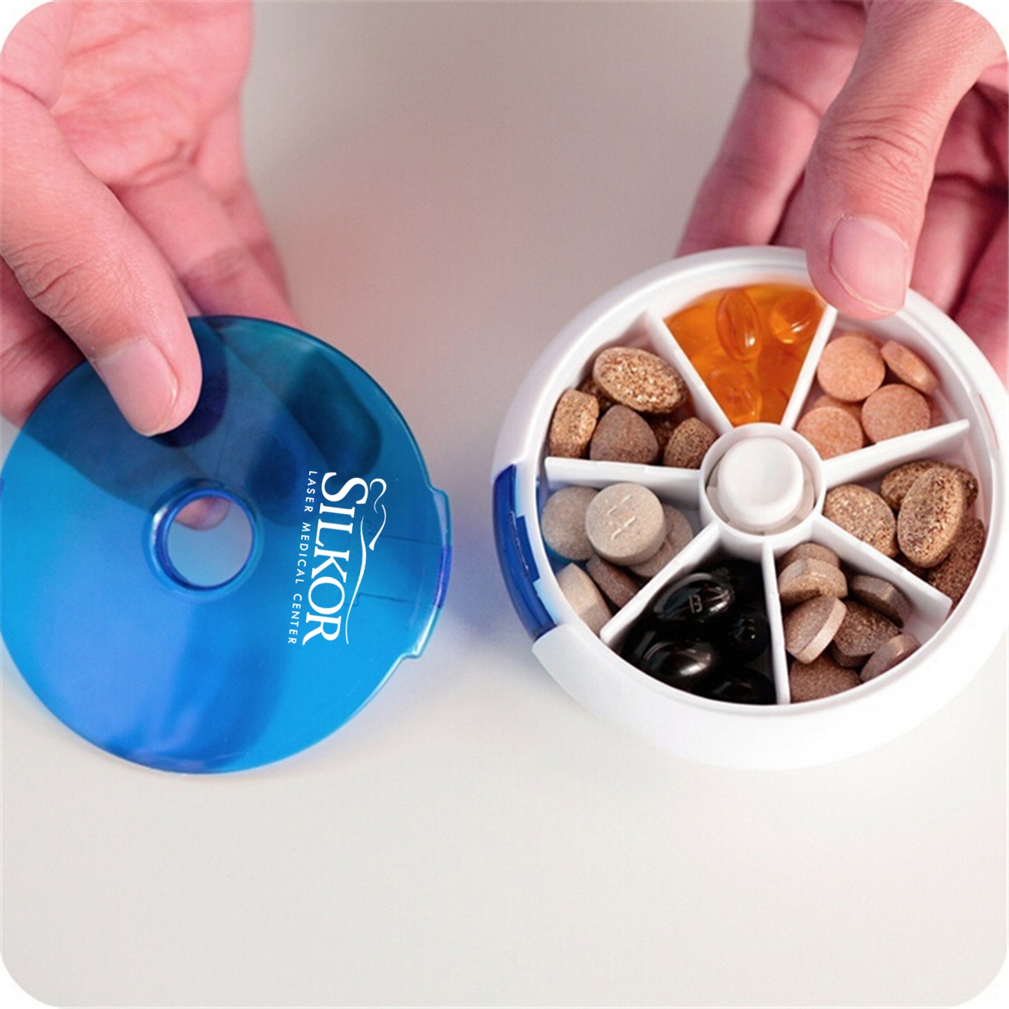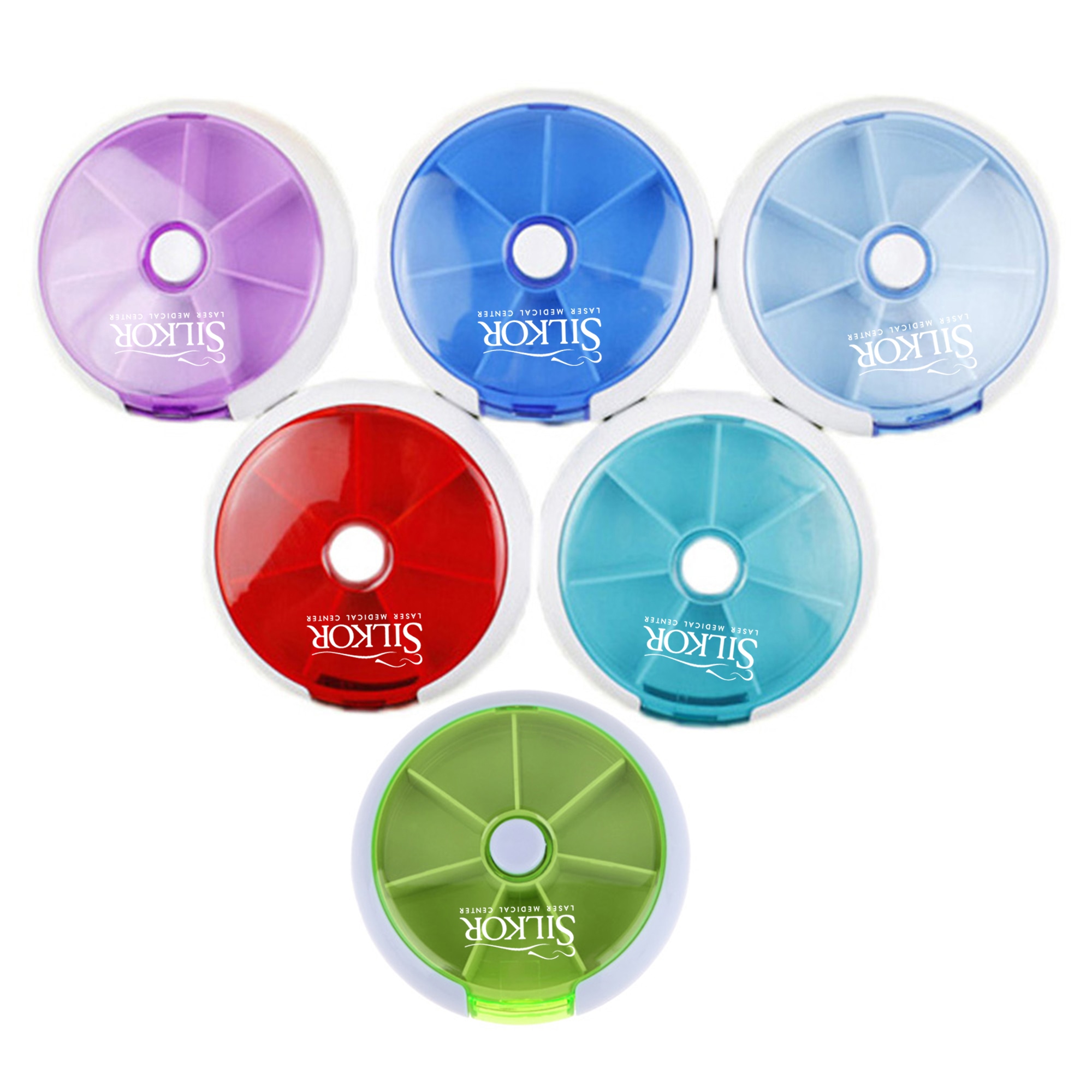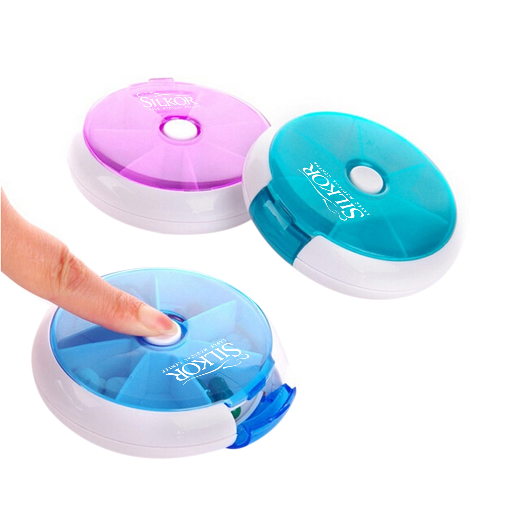 Description:A positive return on your investment is assured when you use Round 7 Compartment Rotate Pill Box as your promotional gift. With features such as round shape, 7 separate compartments, thickness 2mm, transparent lid, middle push button rotate one box and the ability of storing medicine, clients will not only use it, they will remember who gave it to them.