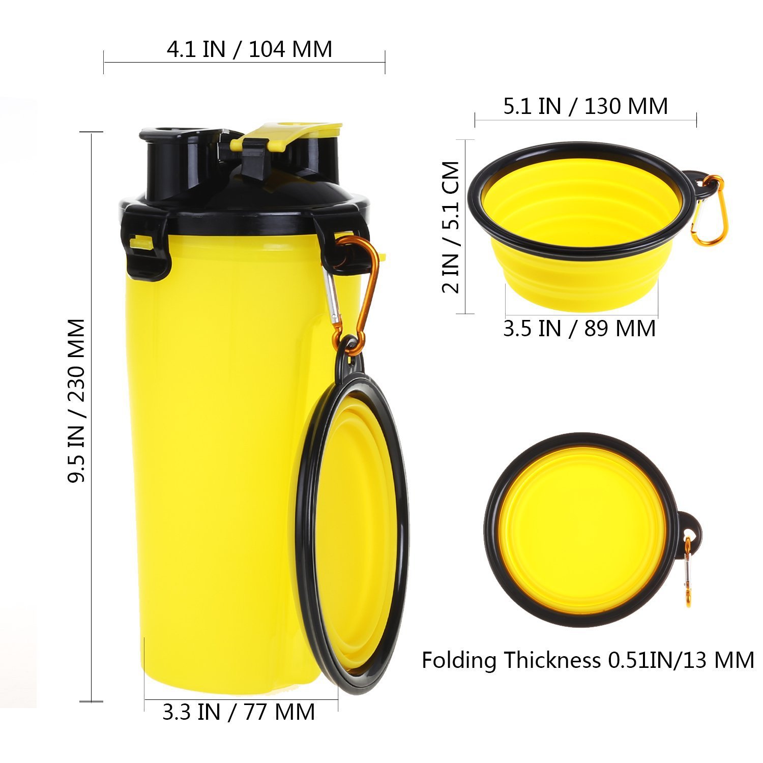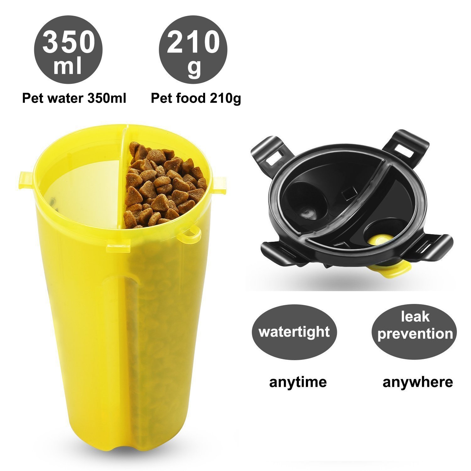 Description:Safe and environmental protection material: The dog food container and the water bottle use the high quality food grade abs & pc material, does not contain the bpa. This material is 100% healthy for your pet. leak-proof design: Food-grade silicone water-proof pads prevent leaks, so you can put the bottle in the bag without worrying about leaks. Good sealability, can protect food or water from leaking in your bag or anywhere. pet water and food containers: Dual-use pet water bottles are designed with two chambers-dog water bottles and food storage containers, a practical design that takes up minimal outdoor space and makes it easy to keep pets. The hat has two large lids that allow you to quickly dispense snacks or water. Suitable for all kinds of outdoor activities, especially dog walk