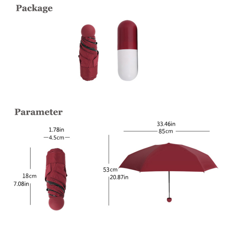 Description:With only 200 g / 0.44 . in weight, this ultra light-weight umbrella can be carried with ease wherever you go.Foldable to 18 cm(about one palm’s length) with 5-fold rib design; compact body can easily be store in your bag or pocket.he mini umbrella comes with a stylish waterproof case that is just over 18 cm long. After you’ve used the umbrella then give it a shake, pop it in the case, and then you can throw it into your bag or car without water getting everywhere.