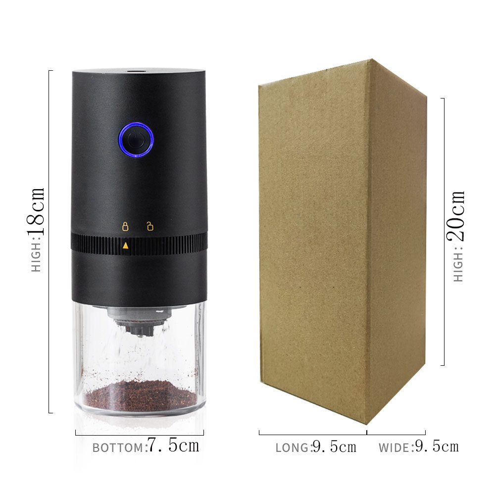 Description:This electric coffee grinder is equipped with 150w copper motor,strong power and low energy consumption,stainless steel two-way structure blade,360 all-round three-dimensional grinding,no dead corners to crush food.Not only coffee beans,it is also suitable for dry solid ingredients such as spices,nuts,grains,peppers,almonds,etc. No need to wait long,you can enjoy the freshest coffee with your family and friends.function: USB C lithium battery charges 1250 mA.Material: PP shell and ABS bean bin ceramic grinding core AS powder bin,copper motor,PC.infinitely adjust the thickness, and the finest can grind 30 mesh coffee powder (More than 90 percent).Bean silo and flour silo can be washed by dishwasher.The blue light works,and the red light flashes to remind you to charge.Non-bean grinding auto