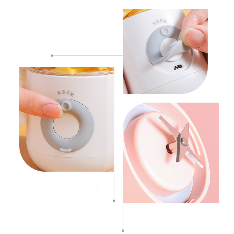 Description:The portable USB charging household four-leaf mixer can be the best choice for making juice, smoothie, baby food and smoothie.The four-leaf blade is more convenient, fast and safe to use. It can be used anytime and anywhere when charged by USB, and it is easy to carry with a hook.There are four colors to choose from, pink, blue, green and purple.The logo can be printed on the bottle cap.The total size of the product is 3.1 x3.1 x 8.8 .