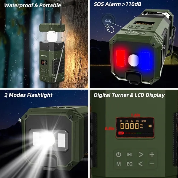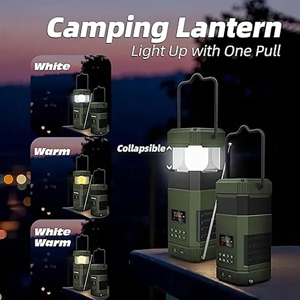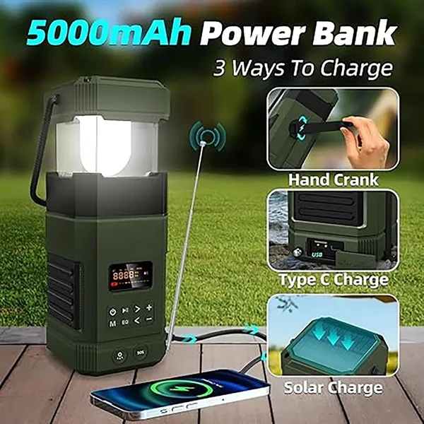 Description:Solar Bluetooth Speaker Camping Flashlight. Music on your mobile phone anytime and anywhere, make your outdoor camping and leisure time more enjoyable, and meet your entertainment and emergency needs. The operation is simple, just pull it gently to light up your camp. Equipped with handle, easy to carry.3 colors to choose from. IPX5 is waterproof and fall-proof, which can withstand falling and is more reliable in hurricanes and storms. Emergency radio supporting USB Type-C fast charging. Manual crank and solar charging ensure continuous power supply in case of emergency. The 5000mAh rechargeable battery provides reliable backup power, and your mobile phone will never run out of power. An emergency flashlight with a solar radio can provide lighting in the dark when there is a power failure.