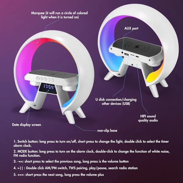 Description:This 5-in-1 table lamp combines functionality and ambiance with a host of features. It offers soft warm light and dynamic colorful modes to create the perfect atmosphere for relaxation, complemented by a Bluetooth speaker with HIFI sound quality for immersive music playback. Enjoy versatile options like TF card, AUX input, and U-disk compatibility for endless entertainment. The integrated 15W Qi wireless charging pad keeps your phone powered up, while dual alarms with white noise help you fall asleep and wake up refreshed. Packaged with a Type-C charging cable, audio cable, and a stylish box, it makes a perfect gift for any occasion.