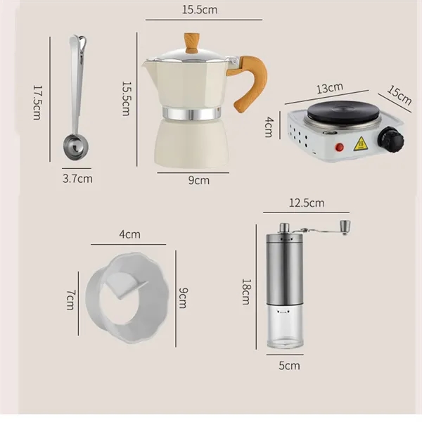 Description:Elevate your coffee experience with our exquisite 7-piece hand-brew coffee set. This comprehensive collection includes a 150ml Moka pot,extract the rich flavors and aromas of your favorite coffee blends. Accompanied by an electric stove, the brewing process becomes effortless and precise, ensuring the perfect temperature every time.The set also features a versatile scoop clip, which not only measures your coffee grounds but also seals your coffee bag for peak freshness. Store your beans in style with our elegant glass coffee bean jar, a chic addition to any kitchen counter.Ensures a clean brew with premium filter papers that remove any unwanted residue and oils.Lastly, the cloth powder duster adds a professional touch, allowing you to evenly distribute your coffee grounds before brewing.