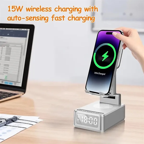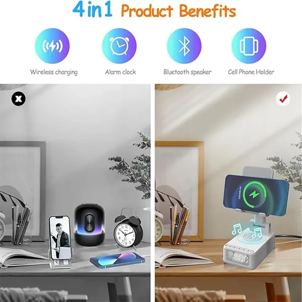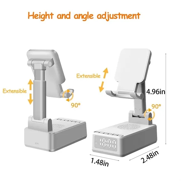 Description:This versatile device is a wireless charger, Bluetooth speaker, alarm clock, and cell phone stand in one. Featuring a Bluetooth 5.3 chip, it delivers high-definition sound with enhanced bass, tight mids, and crystal clear highs. The 15W wireless fast charger supports both horizontal and vertical orientations. The alarm clock, with an HD LCD display and 1500 mAh battery, offers up to 600 hours of standby time, ensuring you never miss important meetings. Its foldable, retractable design adjusts to multiple angles and includes anti-skid silicone for device protection. Compatible with iPhone, Samsung, iPad, and other Android smartphones up to 15 inches, it’s a perfect gift for any occasion.