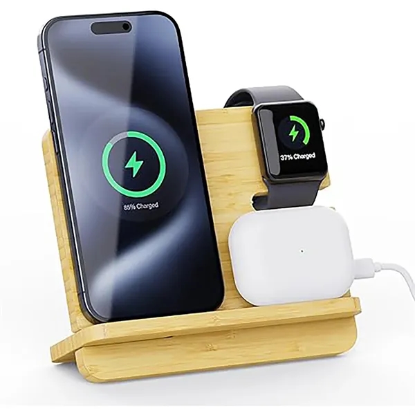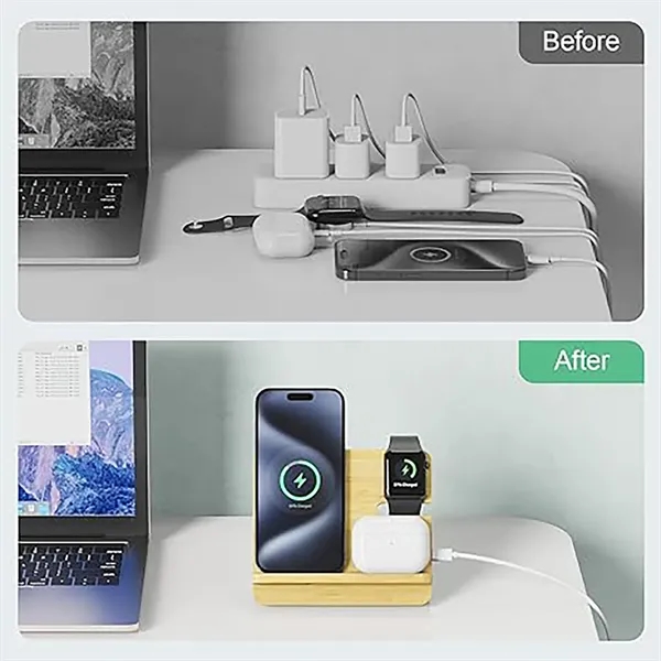Description:Charge up to three devices simultaneously and organized your desktop to tiny. Making it simple and easy to charge your Phone,Watch.Wireless Charging Stand is 100% made with natural fast-growing bamboo, eco-friendly, smooth and sturdy surface, very comfortable and durable to use. With unique wood grain, bring you fresh and relaxed feeling, perfect to place in office, bedroom, living room and other places as a decorative item Magnetic charging station can support up to 20W output, do convenient and fast charging for apple devices. Output for iPhone is up to 15W; for Earphone is up to 5W; 3W standard for Watch. (Note: We recommend using a type-c adapter with a power of no less than 20W, otherwise when all devices are charged, charging will be slower).With CE, FCC certification.